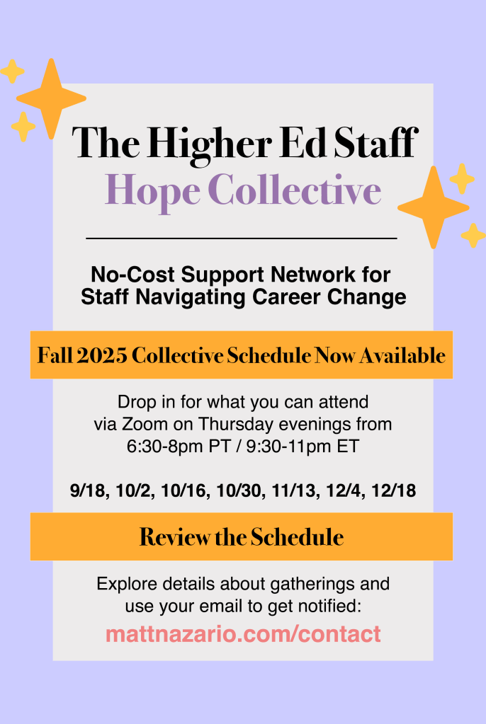 As I mentioned in my initial announcement about the Higher Education Staff Hope Collective, we plan to have regular, no-cost gatherings that take place virtually. These will be held via Zoom every other Thursday from 6:30-8pm PT / 9:30-11pm ET beginning on Sept. 18, 2025.