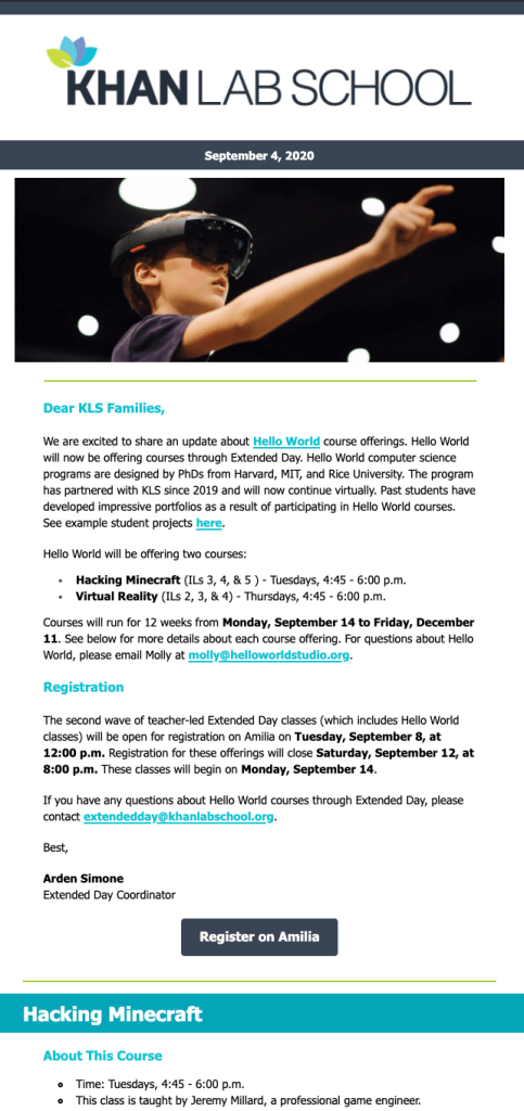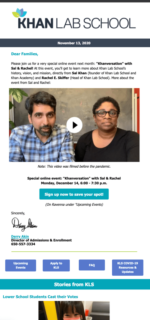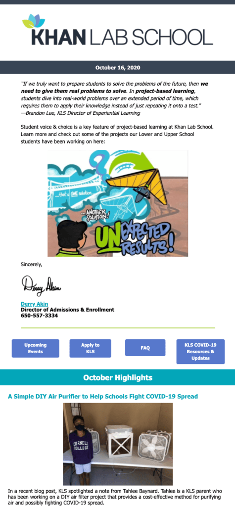A collection of one-off email campaigns wherein I led layout, design, content production (including visuals and writing), and strategic communication to identified audiences. Constituency groups for these emails included current students and families, faculty, staff, and/or prospective students and families.